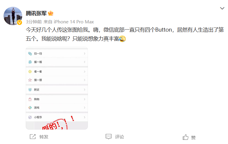 张军表示:“今天好几个人传这张图给我。嗨,微信底部一直只有四个 Button,居然有人生造出了第五个。我能说啥呢?只能说想象力真丰富。”